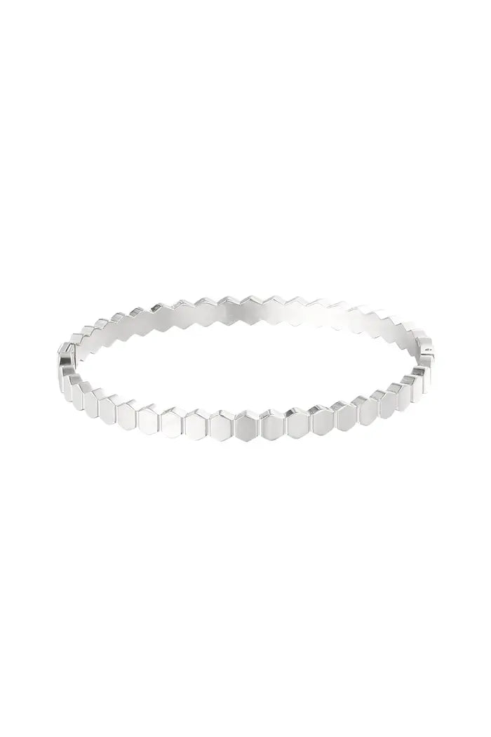 Hoe cool is deze slavenarmband in de vorm van verbonden zeshoeken van LivLux! De armband is perfect om te dragen tijdens een chique gelegenheid, maar kan ook speels gedragen worden door meerdere armbanden met elkaar te combineren. De armband is gemaakt van roestvrij staal en heeft een diameter van 5,8 cm. Verkrijgbaar in de kleuren goud en zilver.