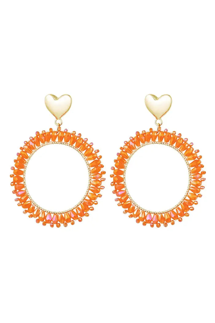 Prachtige ronde oorbellen met oranje of blauwe kristallen kralen en een gouden hartje. De oorbellen zijn perfect om je outfit wat meer kleur te geven! Ook leuk als je voor een kleurrijke outfit gaat! De oorbellen zijn gemaakt van kristallen kralen en legering. De oorbellen ronde kristallen kralen hebben een afmeting van 5,9 cm en zijn leuk te combineren met meerdere kleine gouden oorbellen.