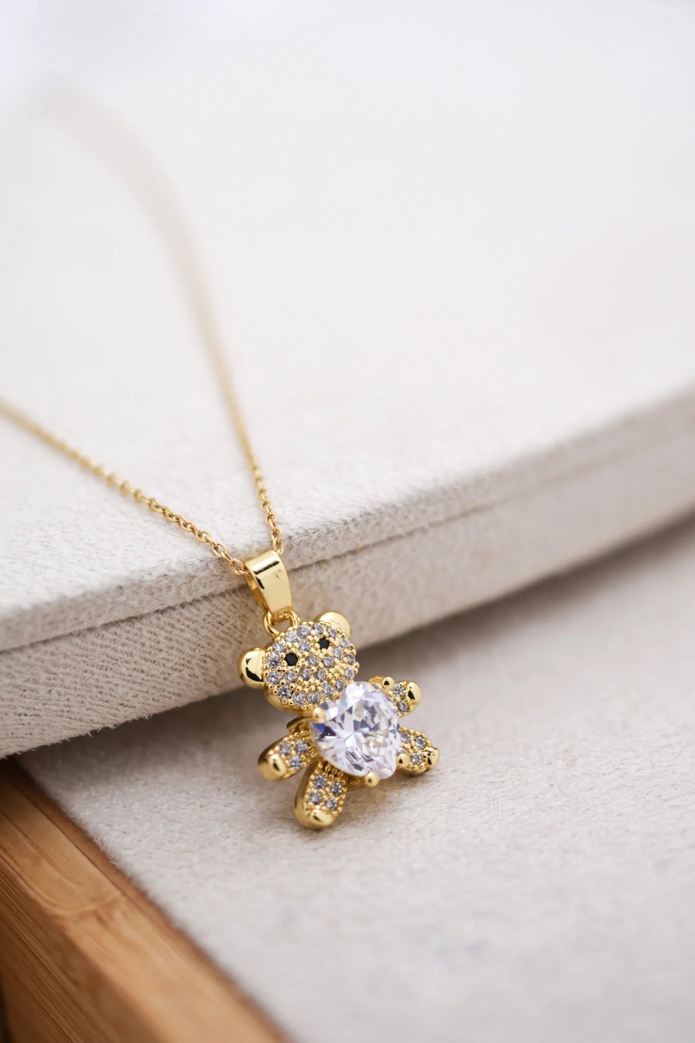 Omg one of our best selling necklace is this Teddy necklace! This one is really too cuteeeeee. The necklace is stainless steel and gold plated. The teddy is encrusted with zirconia stones and has a heart in the middle.