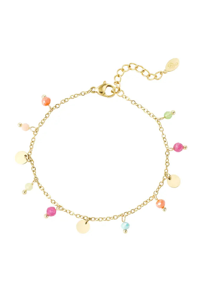Are you looking for a trendy gold bracelet with colors for your shop? Then this gold bracelet with charms is for you! The bracelet is made of stainless steel, glass beads and natural stone. The size of the bracelet is 16cm and is 3cm adjustable.